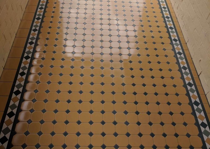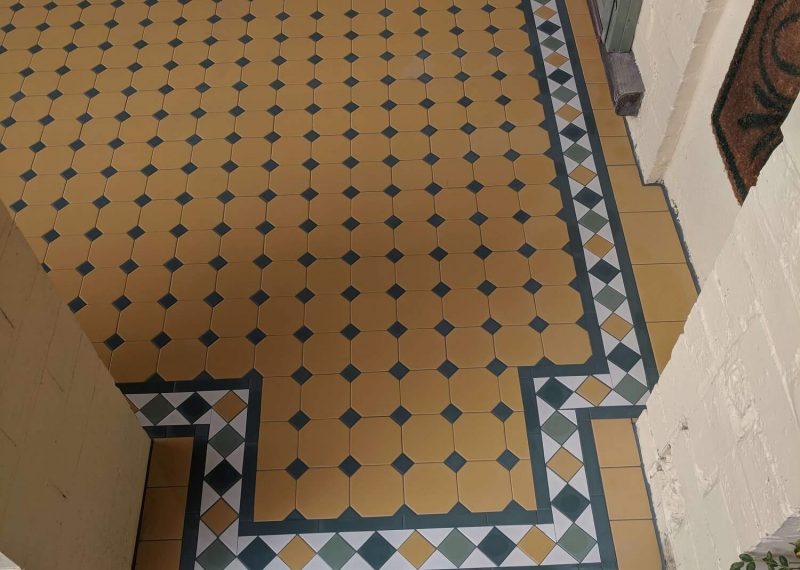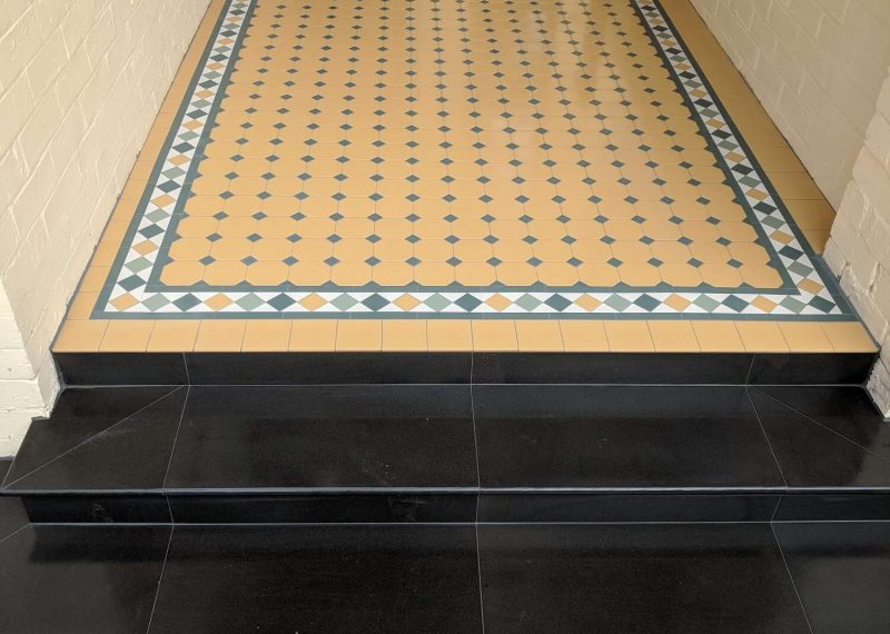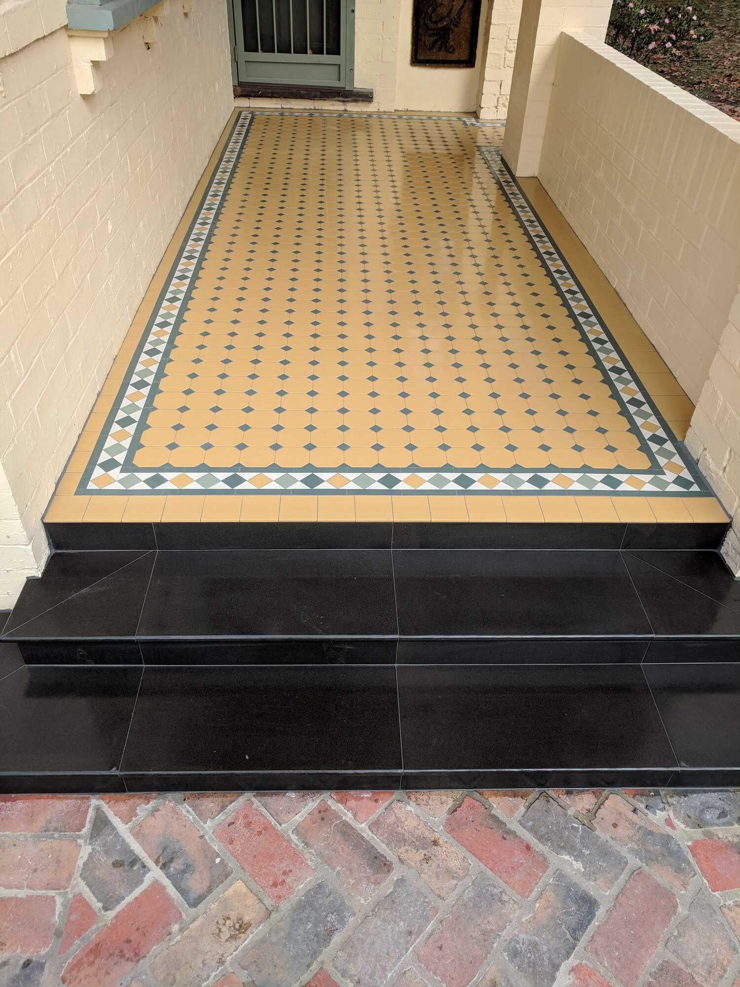 A modern Victorian classic. A black and white Oxley pattern and Norwood border with a few encaustics scattered through the border and a bluestone walkway.